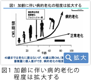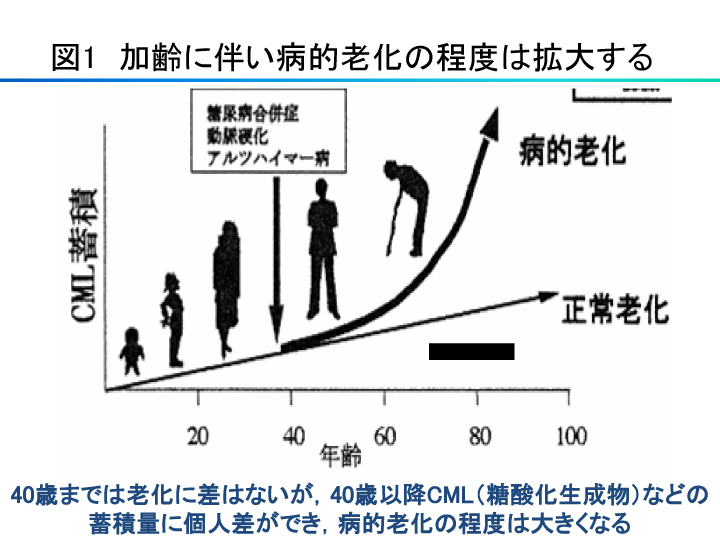 みなさん、「二十歳」は見た目も同じように見え、健康にも通常格差がないことは実感されていると思います。この状態は40歳くらいまで続きます。しかし、40歳以降、加齢に伴って病的な老化の程度は拡大します(図1)。なぜ多少の老化と病的な老化の差がでるのかといいますと、CML(カルボキシルメチルリジン:糖酸化生成物)などの蓄積量に個人差ができるからです。このCMLは老化現象の原因物質ともいわれ始めているAGEの1つです。