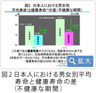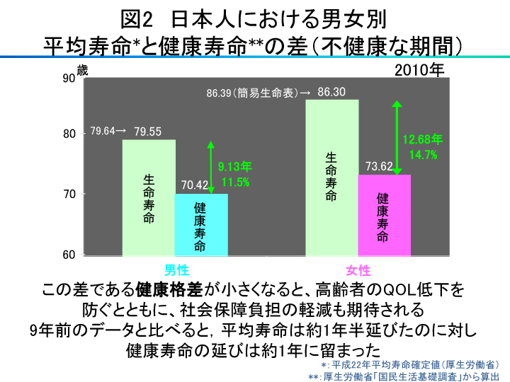 日本人女性における生命寿命は東日本大震災が起こる前までは26年間連続世界一でした。現在、第2位で86.3歳ですが、健康寿命は73.6歳にすぎません(図2)。