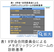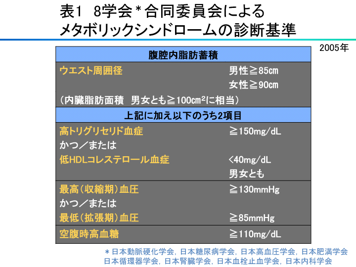 メタボは内科系8学会の合同委員会で2005年に診断基準が作成されました(表1)。ウェスト周囲径が男性では85cm以上、女性では90cm以上だと、内臓脂肪面積が100cm2以上に相当する腹腔内脂肪蓄積が示唆されます。この条件を満たした上で、高トリグリセリド血症かつ/または低HDLコレステロール血症、最高血圧かつ/または最低血圧の上昇、そして空腹時の高血糖のうち、2項目を満たせば、メタボと診断されます。
