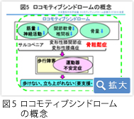 一方、ロコモとは、介護予防のために2007年に日本整形外科学会により提唱された運動器の脆弱性を表す概念です。「運動器の働きが衰え、くらしの中の自立度が低下し、介護が必要になったり、寝たきりになる可能性が高い状態」と定義されています。原因として、筋力やバランスの低下、変形性膝関節症や骨粗鬆症や変形性脊椎症といった運動器疾患が考えられます(図5)。