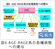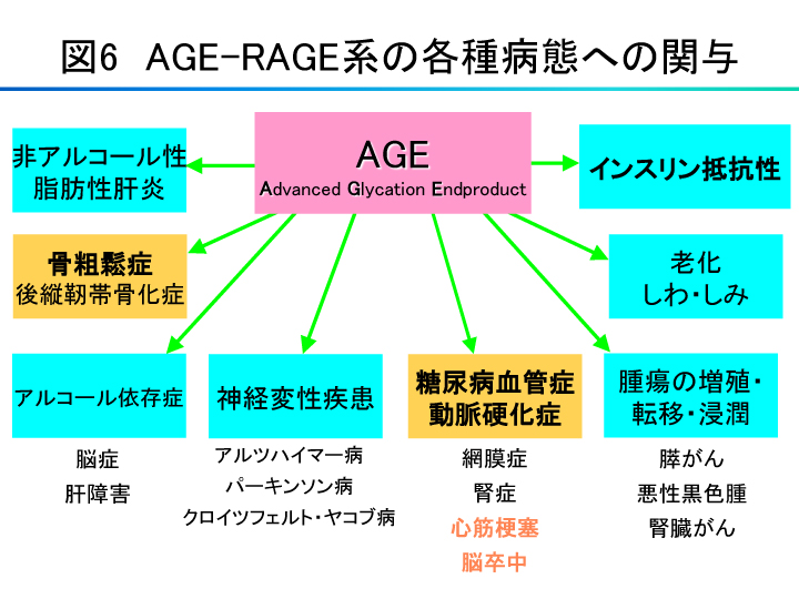 そして、冒頭で病的な老化にはAGEの蓄積量が関係するというお話をしましたが、男女の介護要因となるメタボとロコモにはいずれもAGEが関与しています。AGEはメタボの主因となるインスリン抵抗性にも直接関係し、糖尿病による血管症、そして男性の要介護原因の脳卒中にも関わりがあります。女性の要介護原因はロコモというお話をしましたが、AGEはロコモの原因疾患となるサルコペニア(筋肉減少症)、骨粗鬆症、変形性関節症や脊椎症とも関係します(図6)。