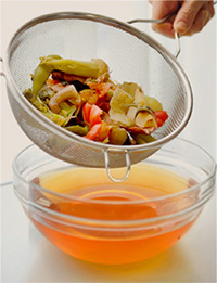 ③ ざるで漉したらべジブロスの完成。冷蔵庫保存で5日間、冷凍で1ヶ月で使いきります。